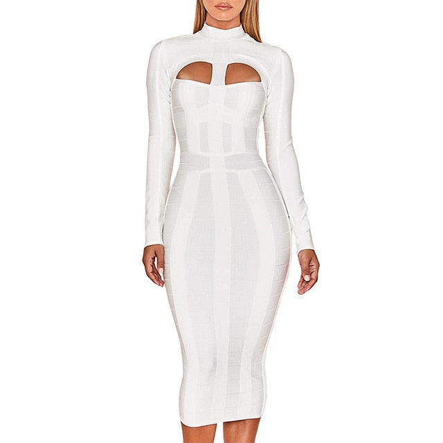 Cut Out High Neck Long Sleeve Party Midi Dress